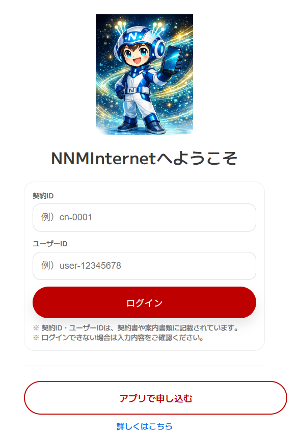 ログイン画面を開き、契約後1週間ほどで発行される契約開通通知書に記載の契約IDを入力します。